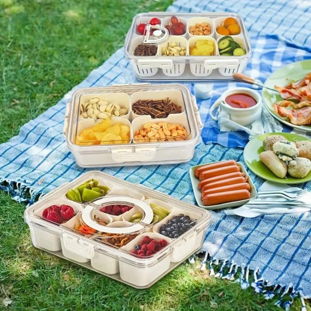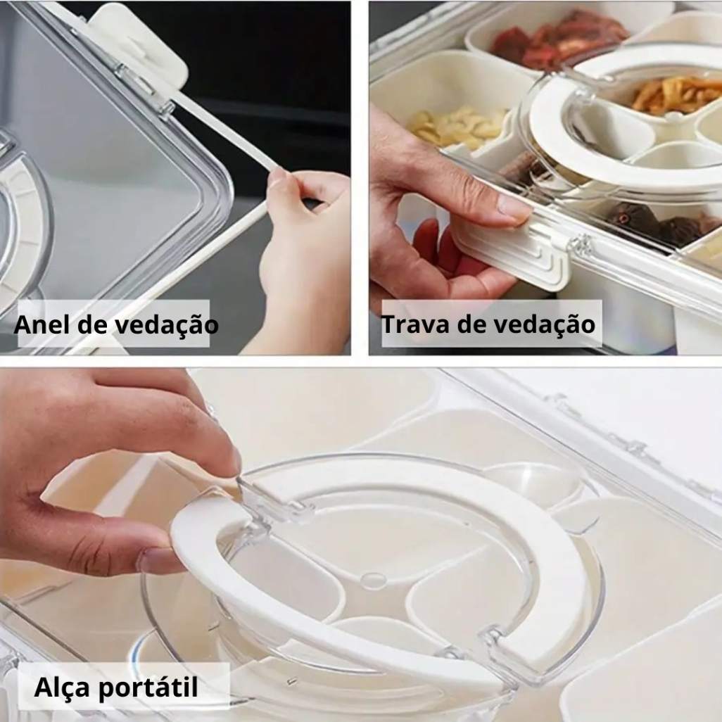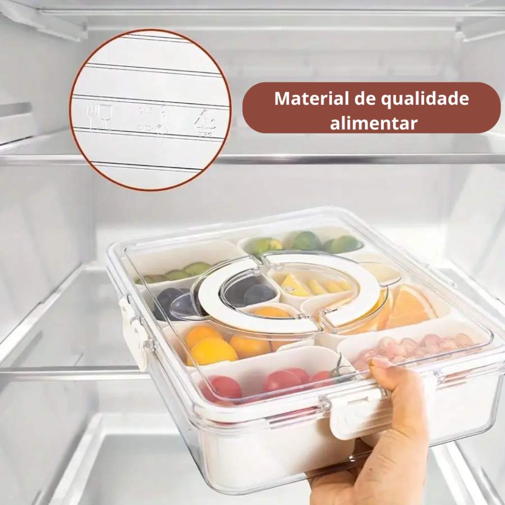 Recipiente organizador de lanches com divisórias, perfeito para levar frutas, snacks, frios e petiscos de forma prática e segura no dia a dia.